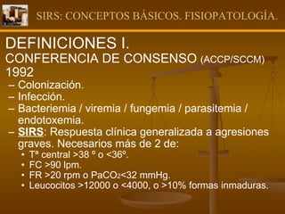 Este documento define los conceptos básicos de SIRS (Síndrome de Respuesta Inflamatoria Sistémica), sepsis y shock séptico según las conferencias de consenso de 1992 y 2001. Explica la fisiopatología del SIRS, incluyendo la activación del endotelio, la producción de citoquinas proinflamatorias y la apoptosis. También cubre los mecanismos moleculares y los polimorfismos genéticos que afectan la respuesta del huésped a la infección.