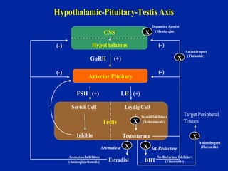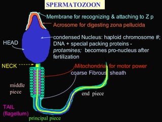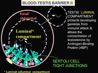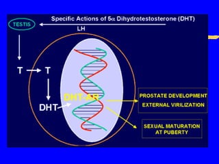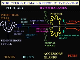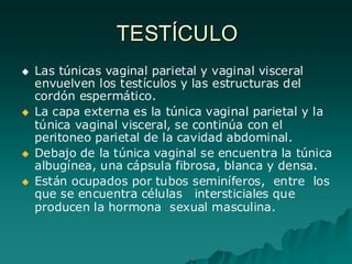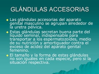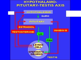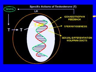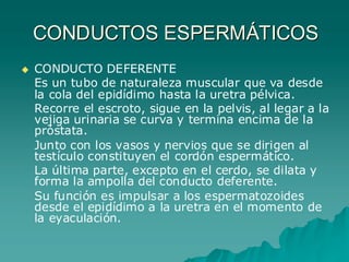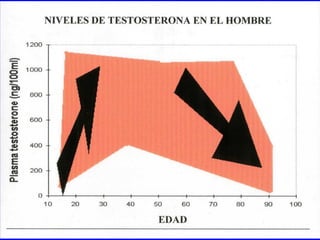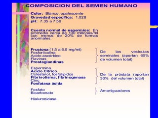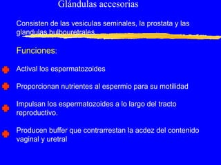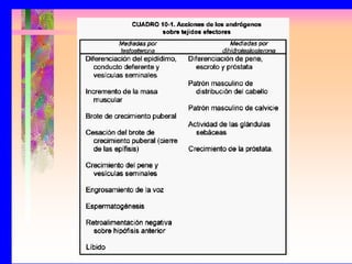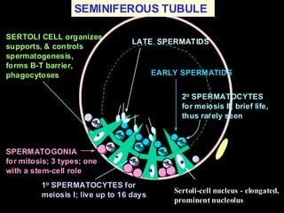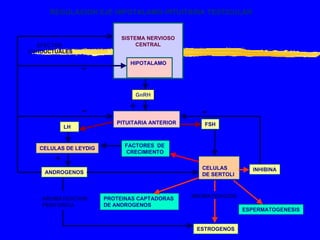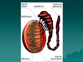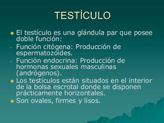 El documento describe el sistema reproductor masculino. Explica que los testículos producen espermatozoides y andrógenos como la testosterona. Describe el proceso de espermatogénesis que toma 64 días y ocurre en los túbulos seminíferos de los testículos. Las células de Sertoli y Leydig juegan un papel importante en la espermatogénesis y producción de hormonas. La testosterona induce el desarrollo masculino y la espermatogénesis.