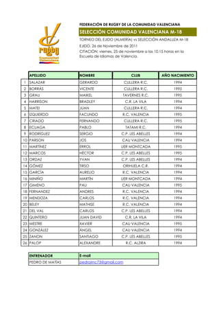 Este documento presenta la convocatoria de la selección de rugby de la Comunidad Valenciana categoría M-18 para un torneo en El Ejido, Almería contra la selección andaluza M-18. Se lista la plantilla de 26 jugadores convocados con sus datos y clubes. También se proporciona información sobre la citación, salida en autobús hacia Almería el viernes 25 de noviembre e indicaciones sobre documentación necesaria para los jugadores.