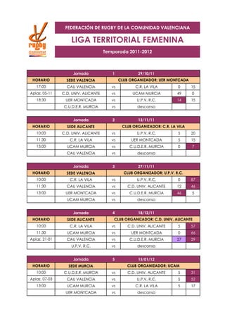 Este documento presenta los resultados de las 13 jornadas de la Liga Territorial Femenina de Rugby de la Comunidad Valenciana de la temporada 2011-2012. En la clasificación final, la Universidad Politécnica de Valencia terminó en primer lugar con 28 puntos, seguida por UER Moncada con 25 puntos y la Universidad de Alicante con 20 puntos.