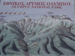 Este documento describe varios lugares sagrados y montañas en Grecia, incluyendo Meteora y sus monasterios construidos en rocas, el desfiladero del río Enipeas y el monasterio de Aghios Dhionisios, y el Monte Olimpo donde residían los dioses griegos según la mitología. El documento proporciona detalles sobre la historia, geografía y atracciones religiosas de estas áreas, así como fotos de los paisajes montañosos y monasterios.