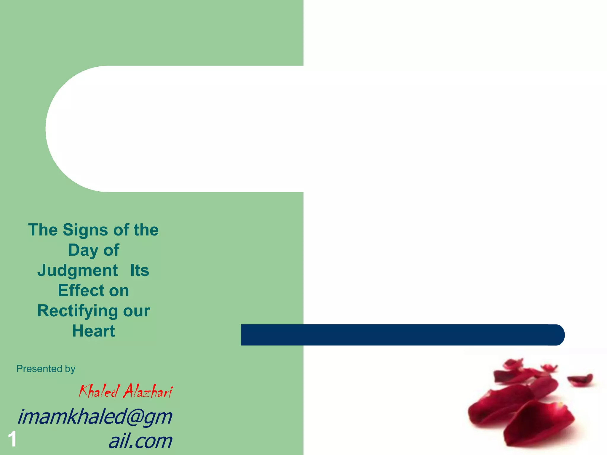 Este documento habla sobre los signos del Día del Juicio Final y cómo afectan la rectificación del corazón. El autor, Khaled Alazhari, discute varios signos como guerras, terremotos y desastres naturales. También explica cómo estos signos deberían motivar a las personas a mejorar sus acciones y acercarse más a Dios.