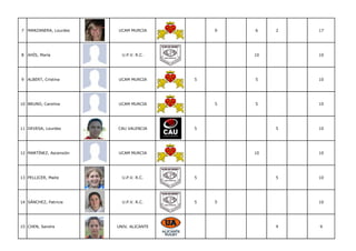 Este documento presenta las clasificaciones de jugadoras de rugby de la Comunidad Valenciana en la temporada 2012-2013 en tres categorías: puntos totales, ensayos y puntos con el pie. En puntos totales, Macarena Estrella del CAU Valencia lidera con 43 puntos. En ensayos, Molly Bradbury del CAU Valencia anotó 7 ensayos. Y en puntos con el pie, Macarena Estrella del CAU Valencia obtuvo 28 puntos.