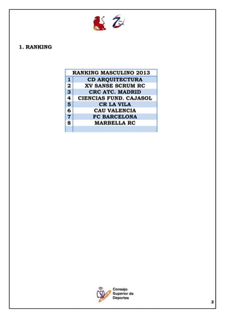 El documento presenta el calendario del Campeonato Nacional de Rugby 7 Masculino que se celebrará en Marbella del 14 al 15 de junio de 2013. Participarán 8 equipos divididos en 2 grupos, liderados por el CD Arquitectura y el XV Sanse Scrum RC según el ranking. El viernes tendrá lugar la primera jornada de la liguilla con 4 partidos por grupo. El sábado serán las semifinales y finales para determinar los puestos bronce, plata y oro.