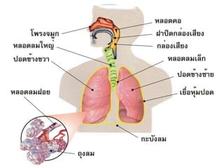 Este documento describe las principales partes del cuerpo humano, incluyendo los órganos respiratorios como la nariz, tráquea y pulmones; los músculos respiratorios como los músculos intercostales; las membranas que envuelven los pulmones como la pleura; y los órganos digestivos como la boca, glándulas salivales, estómago y intestinos delgados.