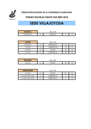 Este documento resume los resultados de varios partidos de rugby juveniles que tuvieron lugar el 28 de noviembre de 2009 en Villajoiosa como parte de un torneo organizado por la Federación de Rugby de la Comunidad Valenciana. Presenta los resultados de las categorías Infantil 6, Alevín, Benjamín y Prebenjamín.