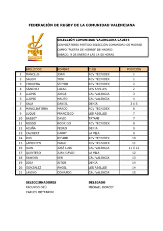 Este documento convoca a los jugadores de rugby juvenil y cadete de la Comunidad Valenciana para partidos contra la selección de la Comunidad de Madrid. Se lista el nombre, apellido, club y posición de cada jugador seleccionado para los equipos juvenil y cadete. También se nombra a los seleccionadores y al delegado que los acompañará.