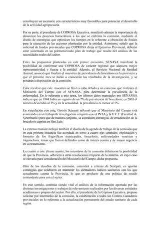 Funcionarios del Ministerio del Campo se reunieron con la Comisión Provincial de Sanidad Animal para coordinar acciones que favorezcan la producción agropecuaria. Se discutió la agenda sanitaria, incluyendo temas como brucelosis, enfermedades venéreas y triquinelosis. También se propuso la creación de un manual de operaciones con la política de estado sobre sanidad animal y mejorar la representatividad de la comisión a nivel regional.