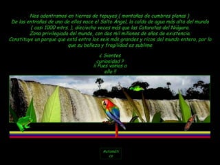 El documento describe el Parque Nacional Canaima en Venezuela, una zona de 2 mil millones de años que contiene el Salto Ángel, la caída de agua más alta del mundo. El parque está formado por montañas de cumbres planas llamadas tepuyes y fue declarado Patrimonio de la Humanidad en 1994 debido a su belleza, fragilidad y ser uno de los seis parques más grandes y ricos del mundo.