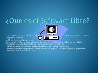 El documento define el software libre como aquel que otorga a los usuarios cuatro libertades fundamentales: la libertad de ejecutar el programa con cualquier propósito, estudiar y modificar el código fuente, distribuir copias y mejoras del software para que toda la comunidad se beneficie. El término hace referencia a la libertad del usuario más que al precio.