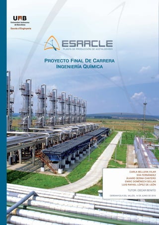 Este documento proporciona información sobre las tuberías, válvulas, bombas y accesorios utilizados en una planta de producción de acetaldehído. Incluye tablas con los detalles técnicos de cada elemento, como el diámetro, material, fluido transportado, presión y temperatura de operación. También presenta listados de tuberías, válvulas, bombas y compresores agrupados por áreas de la planta, con su numeración y especificaciones.