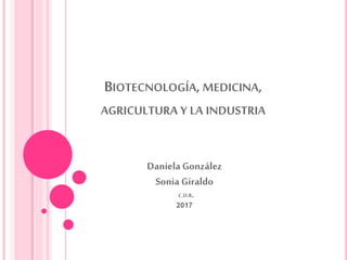 La biotecnología se aplica a la medicina, agricultura e industria. En medicina, ayuda al diagnóstico y tratamiento de enfermedades a través de especialidades como neurocirugía y oftalmología. En agricultura, la biotecnología mejora cultivos a través de la selección de plantas y el cultivo in vitro para crear variedades resistentes. También permite transferir genes entre organismos para conferir ventajas como resistencia a plagas.
