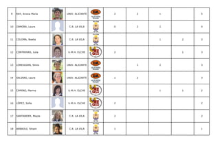 Este documento presenta los resultados de la categoría femenina del torneo de tenis Sevens Series Alicante 2011. Jessica del Río del Universidad de Alicante ganó con un total de 16 puntos. Rabeb Namir del Club de Tenis La Vila quedó en segundo lugar con 12 puntos totales. Alejandra Moyano del Universidad de Alicante quedó en tercer lugar con 10 puntos totales.