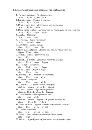 Este documento presenta una serie de oraciones con palabras o frases omitidas que deben completarse con los preposiciones correctas. El texto también incluye refranes españoles y sus equivalentes, así como sinónimos de varias palabras en español.