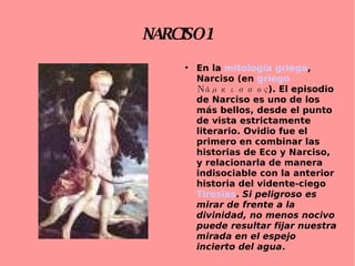 El documento presenta la historia de dos personajes mitológicos griegos: Narciso y Sísifo. Narciso se enamoró de su propia imagen reflejada en el agua y murió ahogado. Sísifo fue castigado en el infierno a empujar eternamente una gran roca colina arriba.