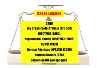 El documento aborda la gestión de riesgos ocupacionales y las normativas legales relacionadas con la seguridad y salud en el trabajo, incluyendo la Ley Orgánica de Trabajo y la LOPCYMAT. Se destacan las condiciones inseguras, actos inseguros, y la definición de enfermedades y accidentes ocupacionales, junto con los criterios de sanciones por incumplimientos. Además, se menciona el papel del INPSASEL en la regulación y asesoramiento en esta área.