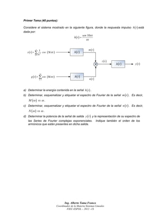 Este documento presenta un examen de sistemas lineales que consta de 3 problemas. El primer problema involucra determinar la energía y espectros de Fourier de varias señales dadas en un sistema. El segundo problema pide determinar la transformada inversa de Fourier de una señal dada. El tercer problema implica determinar la respuesta al impulso y estabilidad de un sistema de diferencias discretas definido por su ecuación.