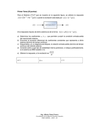 Este documento presenta un examen de sistemas lineales que consta de 4 problemas. El primer problema trata sobre un sistema de tiempo continuo (LTI-CT) y solicita determinar coeficientes, obtener la ecuación diferencial y función de transferencia, y analizar estabilidad. El segundo problema involucra dos subsistemas integradores en cascada y pide determinar respuesta impulso, función de transferencia y respuestas. El tercer problema trata sobre un sistema en el dominio de la frecuencia y pide función de transferencia, respuesta impulso, diagrama de bloques y