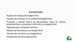 Google Drive es un servicio de almacenamiento en la nube que ofrece 15 GB de espacio gratuito para cada usuario. Permite acceder a archivos desde cualquier dispositivo y crear y editar documentos, hojas de cálculo, presentaciones y formularios. Los usuarios pueden compartir archivos y diseñar formularios, y hay versiones disponibles para escritorio y móviles. Para empezar a usarlo, se debe crear una cuenta de Gmail e instalar la aplicación de escritorio o móvil de Google Drive.