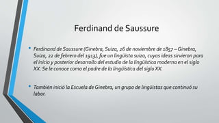 Ferdinand de Saussure fue un lingüista suizo del siglo XX considerado el padre de la lingüística moderna. Desarrolló ideas que sirvieron para iniciar el estudio de la lingüística en el siglo XX e inició la Escuela de Ginebra, un grupo de lingüistas que continuó su labor. Saussure analizó la lengua, el lenguaje y el habla y sus diferencias.