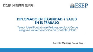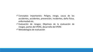 Este documento trata sobre la identificación de peligros, evaluación de riesgos e implementación de controles (IPERC). Explica los conceptos clave de peligro, riesgo, causas de accidentes y prevención. Describe las etapas de evaluación de riesgos y metodologías para realizarla, incluyendo índices para estimar el riesgo. Finalmente, detalla los tipos de medidas de control a implementar según la jerarquía, desde la eliminación del peligro hasta el uso de equipos de protección personal.