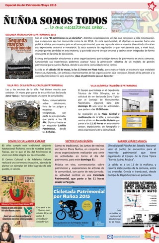 Este documento contiene información sobre varias actividades relacionadas con el Día del Patrimonio que se llevarán a cabo el sábado 30 y domingo 31 de mayo en diferentes sectores de la comuna de Ñuñoa, Chile. Entre las actividades se incluyen rutas patrimoniales, conversatorios, ferias, exhibiciones fotográficas y un caldillo patrimonial. La mayoría de las actividades comenzarán a las 11 horas.
