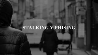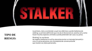 El documento habla sobre el stalking y el phishing. Define el stalking como acechar a alguien de forma insistente y reiterada, como hacen los depredadores con su presa. Explica que el phishing implica enviar mensajes engañosos para robar datos personales. Da ejemplos de casos reales de stalking y phishing, e incluye recomendaciones para prevenir estas amenazas como usar contraseñas seguras, autenticación en dos pasos y soluciones antivirus. También enlaza artículos adicionales sobre el tema.