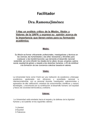 La misión de la UAPA es formar profesionales, investigadores y técnicos para contribuir al desarrollo nacional sostenible y difundir valores como la cultura de paz, justicia social y equidad de género. Su visión es ser una institución de excelencia académica a nivel nacional e internacional con personal calificado y creador de conocimiento para contribuir al desarrollo humano. Los valores de la UAPA son la libertad, equidad y tolerancia.