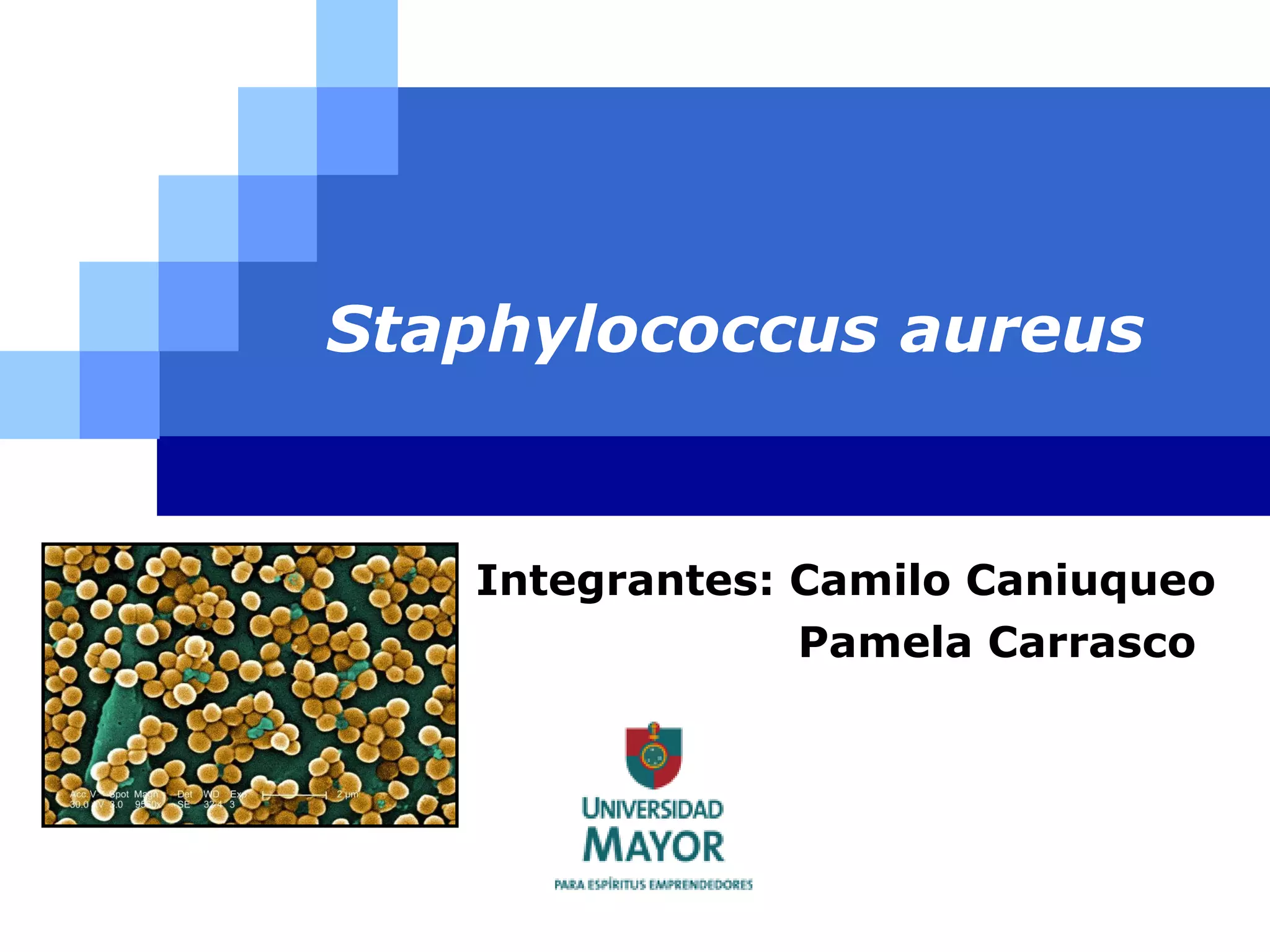 El documento describe a Staphylococcus aureus, una bacteria común que se encuentra en la piel y mucosas de humanos. S. aureus puede causar una variedad de infecciones, desde leves como forúnculos hasta graves como endocarditis bacteriana. Produce toxinas que causan enfermedades mediante daño invasivo a través de estructuras de pared celular y enzimas, o toxicidad a través de potentes toxinas. La prevención incluye el lavado de manos, tratamiento de heridas y evitar la contaminación cruzada de alimentos.
