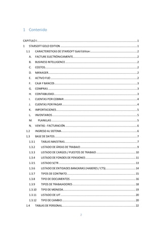 El documento describe el software contable Starsoft Gold Edition, diseñado para optimizar el procesamiento de información en empresas a través de módulos como facturación, contabilidad y gestión de activos fijos. Incluye características como informes de business intelligence y la posibilidad de manejar múltiples transacciones y reportes, facilitando la toma de decisiones estratégicas. También ofrece soporte técnico y actualizaciones continuas, asegurando su adaptabilidad a las normativas y necesidades del mercado.