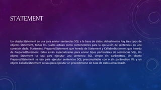 El documento describe el uso de objetos statement en Java para ejecutar sentencias SQL en bases de datos, incluyendo los tipos de objetos como statement, preparedstatement y callablestatement. Se explican los métodos asociados, como executequery, executeupdate y execute, y se menciona la necesidad de cerrar esos objetos para liberar recursos. Además, se incluye un ejemplo de cómo establecer una conexión y ejecutar una consulta SQL.