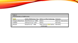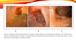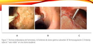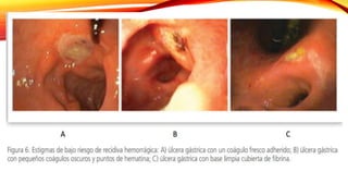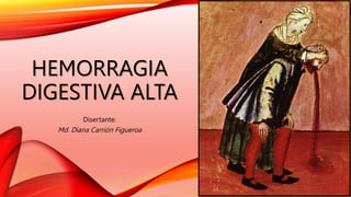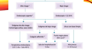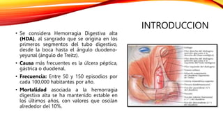 Este documento proporciona información sobre la hemorragia digestiva alta (HDA), incluidas sus causas, presentaciones clínicas, evaluación de pacientes, tratamiento y manejo. Las causas más comunes de HDA son úlceras pépticas y varices esofagogástricas. La evaluación incluye exámenes de laboratorio, escalas de gravedad y endoscopia para identificar la causa. El tratamiento se centra en la reanimación hemodinámica, la supresión ácida y la hemostasia endoscópica