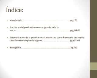 Este documento discute la práctica social productiva como origen del desarrollo teórico y científico-tecnológico. Explica que la práctica social ha sido fundamental en el desarrollo humano y ha dado lugar a avances tecnológicos y culturales. También describe cómo las revoluciones industriales transformaron las sociedades hacia una perspectiva utilitaria y cómo la práctica social se sistematizó para dar respuesta a los nuevos requerimientos del sistema productivo en el siglo XX.