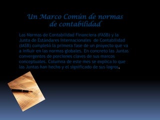 El FASB y el IASB completaron la primera fase de un proyecto para desarrollar un marco conceptual común para las normas contables globales, convergiendo partes claves de sus marcos conceptuales existentes. El proyecto conjunto consta de ocho fases para reemplazar los marcos separados actuales con un marco único que servirá de base para las futuras normas contables de EE.UU. y las NIIF. La conclusión exitosa de este proyecto será esencial para lograr la convergencia total de las normas contables entre las juntas.