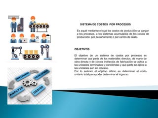 Este documento describe el sistema de costos por procesos, el cual asigna los costos de producción a los procesos productivos y acumula los costos en los departamentos o centros de costo. El objetivo es determinar qué parte de los costos directos e indirectos se aplica a las unidades terminadas y cuál a las unidades en proceso. Este método se usa comúnmente en empresas con producción continua como alimentos, petroquímica y farmacéutica.
