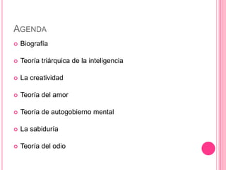 Robert Jeffrey Sternberg desarrolló varias teorías sobre la inteligencia, la creatividad, el amor y la sabiduría. Propuso una teoría triárquica de la inteligencia que incluye componentes analíticos, experienciales y contextuales. También formuló teorías sobre el autogobierno mental, el amor, la creatividad y el odio. Ha recibido numerosos premios por sus contribuciones a la psicología.
