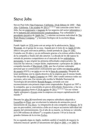 Steve Jobs fue un empresario estadounidense que cofundó Apple Inc. En 1976 junto a Steve Wozniak. Lideró a Apple en la década de 1980 y transformó la industria de la computación personal con el lanzamiento del Macintosh en 1984. Más tarde fundó Pixar y se convirtió en el mayor accionista de Disney. Regresó a Apple en 1997 y lideró la revolución del iPod y iTunes. Falleció en 2011 siendo considerado uno de los empresarios más influyentes de la historia.
