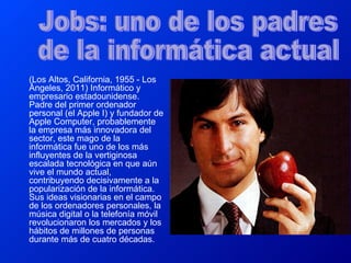 Steve Jobs fue un empresario e informático estadounidense que cofundó Apple Computer. Lideró el desarrollo del Apple I y Apple II, los cuales ayudaron a popularizar las computadoras personales. Más tarde creó el Macintosh, el primer ordenador personal fácil de usar. También compró Pixar y ayudó a producir la primera película animada por computadora, Toy Story. Jobs falleció en 2011 debido a complicaciones de cáncer de páncreas.