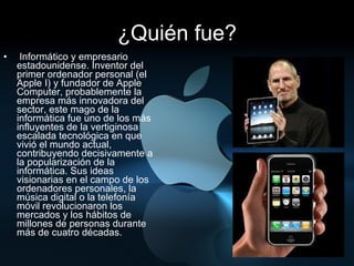 Steve Jobs fue un empresario e inventor estadounidense que cofundó Apple Computer. Inventó el primer ordenador personal, el Apple I, y lanzó el Apple II que se convirtió en el primer ordenador de consumo masivo. Sus ideas revolucionaron la industria de la informática y popularizaron el uso de ordenadores personales y la música digital.