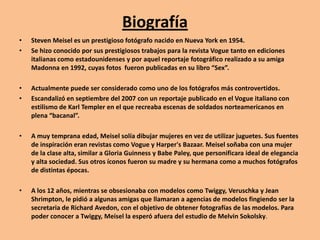 Steven Meisel es un prestigioso fotógrafo estadounidense nacido en 1954 conocido por sus trabajos para Vogue italiana y estadounidense. Se hizo famoso por un reportaje de Madonna en 1992 y por retratar escenas controvertidas. Actualmente es considerado uno de los fotógrafos más controvertidos y ha catapultado la carrera de modelos como Coco Rocha, Snejana Onopka y Sasha Pivovarova.