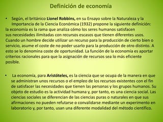 El documento define la economía según diferentes autores como Lionel Robbins, Aristóteles y Adam Smith. Robbins define la economía como el estudio de cómo los seres humanos satisfacen necesidades ilimitadas con recursos escasos. Aristóteles ve la economía como la administración de recursos para satisfacer necesidades humanas. Finalmente, Adam Smith define la economía política como la provisión de ingresos a la gente y al estado. El documento también discute los métodos inductivos y deductivos para estudiar fenómenos económicos, incluyendo la estadística y los