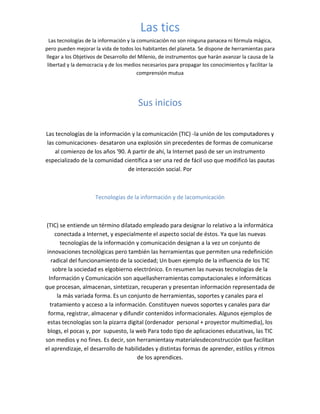 Las tecnologías de la información y la comunicación (TIC) tienen el potencial de mejorar la vida de las personas en todo el mundo al proporcionar herramientas para lograr los Objetivos de Desarrollo del Milenio, promover la libertad y la democracia, y propagar el conocimiento y la comprensión mutua. Si bien las TIC comenzaron como una red especializada para la comunidad científica, la Internet se volvió más accesible en los años 90 y cambió profundamente las formas de interacción social. Las TIC son un conjunto de her