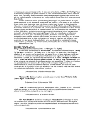 El documento presenta una crítica del doble álbum en vivo 'Bring on the Night' de Sting, destacando su fusión innovadora de jazz y pop durante una gira mundial. Se analizan las actuaciones del músico, su capacidad comunicativa y el talento de su banda, sugiriendo que el álbum establece un nuevo estándar en la música contemporánea. Además, Sting reflexiona sobre sus canciones y el proceso creativo detrás de ellas, subrayando su evolución como compositor.