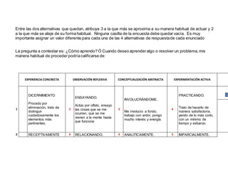 El documento presenta los resultados de una evaluación de estilos de aprendizaje realizada a Stiven Nañez Garcia. La evaluación consistió en una serie de preguntas donde Stiven debía asignar valores de 1 a 4 a diferentes opciones de cómo aprende, dependiendo de cuál describa mejor su manera habitual. Los resultados muestran que Stiven obtuvo 17 puntos en conceptualización abstracta y 2 puntos en experiencia concreta, ubicándolo dentro del estilo de aprendizaje "Asimilador". Adicionalmente, obtuvo 2 puntos en observación reflexiva y