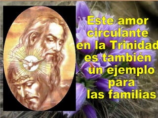 Jesucristo enseñó que Dios no es una persona individual sino una familia de tres personas - Padre, Hijo y Espíritu Santo - unidas por el amor. Dios nos creó para que podamos compartir su amor ahora y por toda la eternidad, imitando su amoroso ejemplo de familia. La Santísima Trinidad merece nuestro amor, alabanza y agradecimiento.