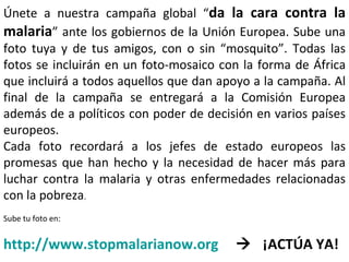 La campaña "Da la cara contra la malaria" pide a la gente que suba fotos suyas a una página web para crear un foto-mosaico con forma de África en apoyo de la lucha contra la malaria. El foto-mosaico se presentará a políticos europeos para recordarles sus compromisos contra la malaria. Además, el Fondo Global lanzó en 2009 la iniciativa AMFm para subvencionar medicamentos contra la malaria y reducir su precio, con el objetivo de reemplazar tratamientos antiguos menos efectivos.