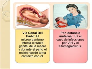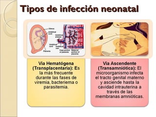 Este documento resume información sobre varias infecciones neonatales, incluyendo sífilis congénita, rubeola, citomegalovirus y herpes. Describe las causas, manifestaciones clínicas, diagnóstico, tratamiento y prevención de cada infección. También incluye estadísticas epidemiológicas y factores de riesgo relevantes. El documento proporciona una visión general completa de estas importantes infecciones que afectan a los recién nacidos.