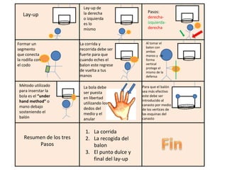 Este documento describe los pasos para realizar un lay-up de baloncesto de forma efectiva. Explica que para un lay-up de la derecha o izquierda, los pasos son los mismos: 1) correr hacia la canasta, 2) recoger el balón con ambas manos en posición vertical para protegerlo, y 3) introducir el balón a la canasta usando los dedos medios y anulares por encima de la mano para anotar.