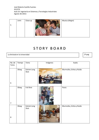 El documento presenta un storyboard de 9 tomas de video para una película sobre la amistad en la universidad. La primera toma muestra un primer plano con música triste, la segunda toma un plano general con música de duda y la tercera toma otro primer plano con música de suspenso. Las siguientes tomas incluyen música alegre y muestran primeros planos y planos medios de conversaciones y risas entre amigos.