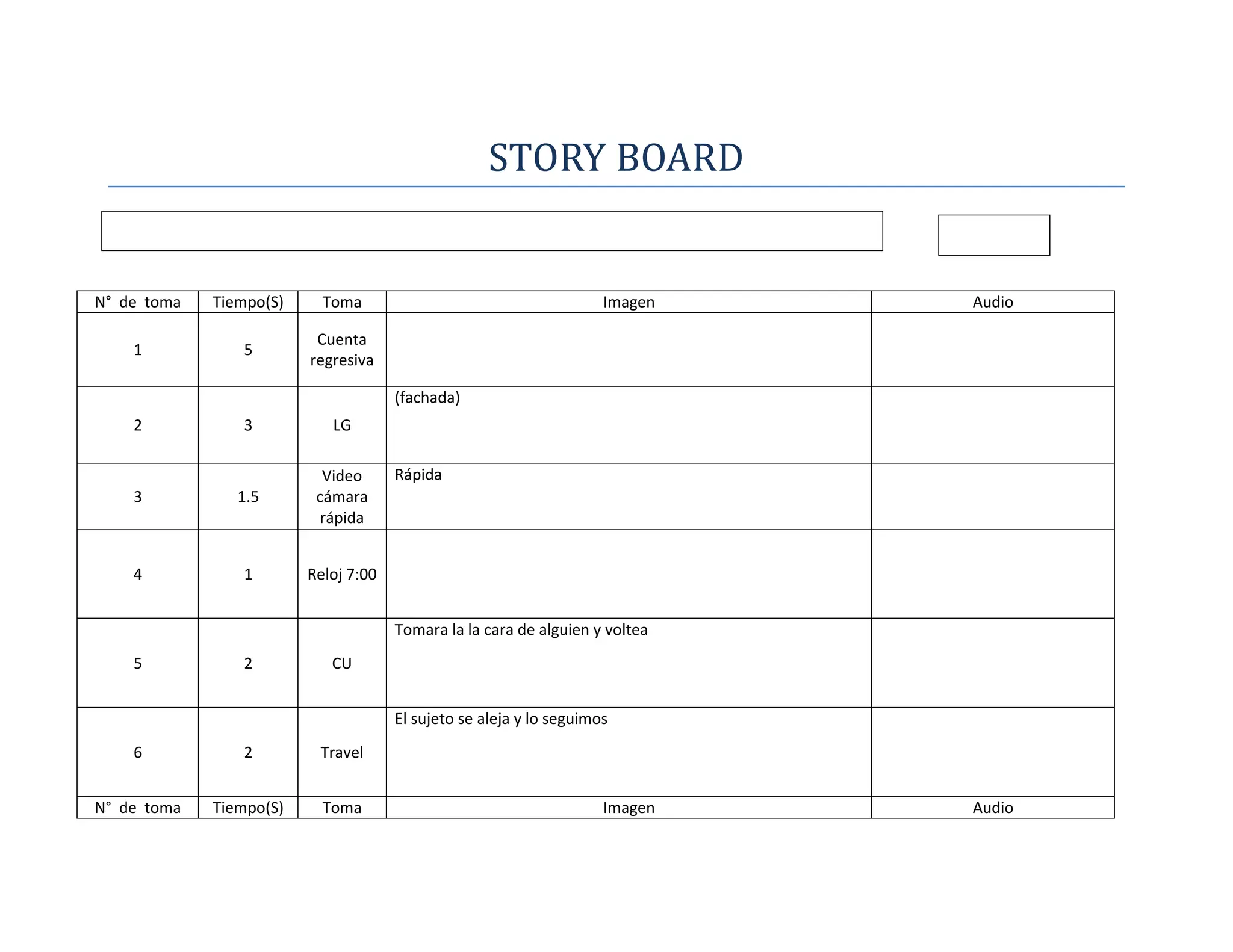 Este documento presenta un storyboard de 15 tomas de video que narran la historia de un estudiante durante un día en la universidad. La historia comienza con el estudiante llegando a clase, luego almorzando con un amigo y lastimándose jugando, siendo atendido en la enfermería. Más tarde, el estudiante visita otros lugares del campus como la biblioteca y sale de la universidad al anochecer.
